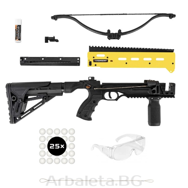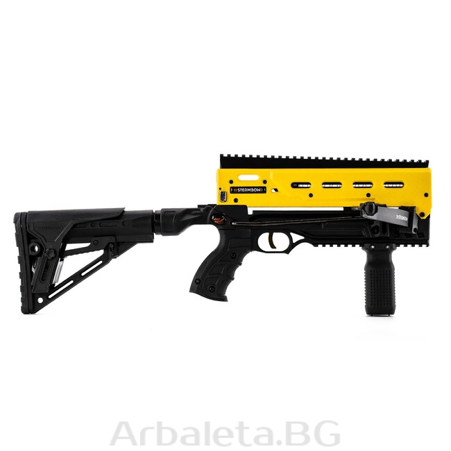 - Ергономичен дизайн: Изработен от висококачествен полимер от стъклена влакна, арбалетът тежи само 1,8 кг и разполага с прибираща се прикладка с регулируема опора за бузата.