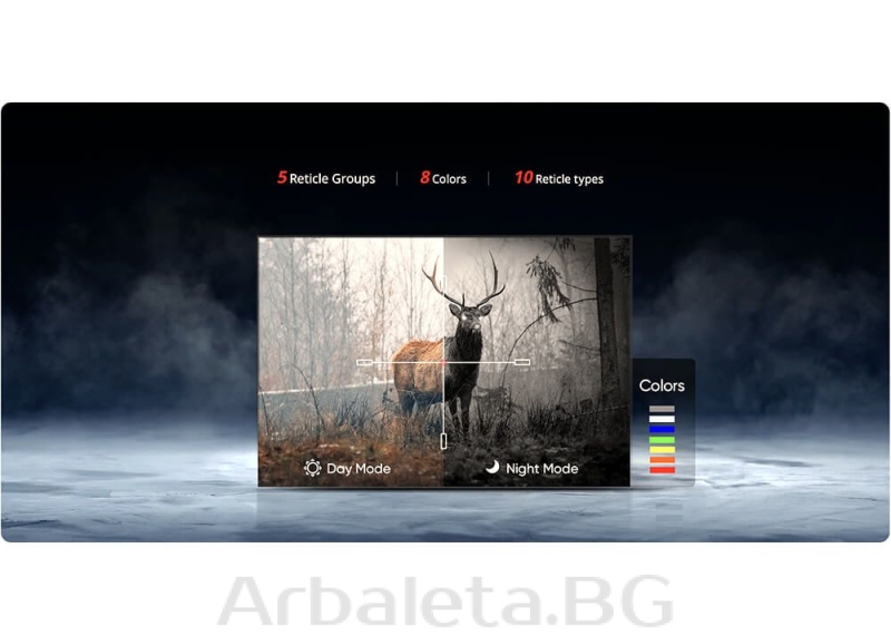 - Control Total asupra Reticulului: Alegeți din 10 tipuri de reticule disponibile în 8 culori diferite pentru a obține contrastul ideal în funcție de mediul de vânătoare.