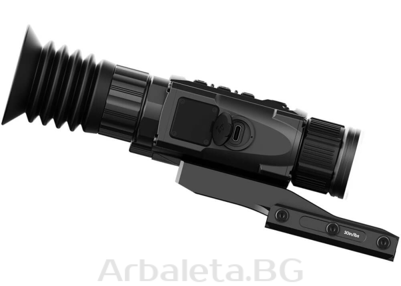 Lunetă Termică (Rifle Scope): Se montează direct pe armă cu ajutorul monturii incluse. Beneficiază de un relief ocular de 65 mm și un ecran Micro-OLED, oferind siguranță și confort chiar și pe calibre mari.